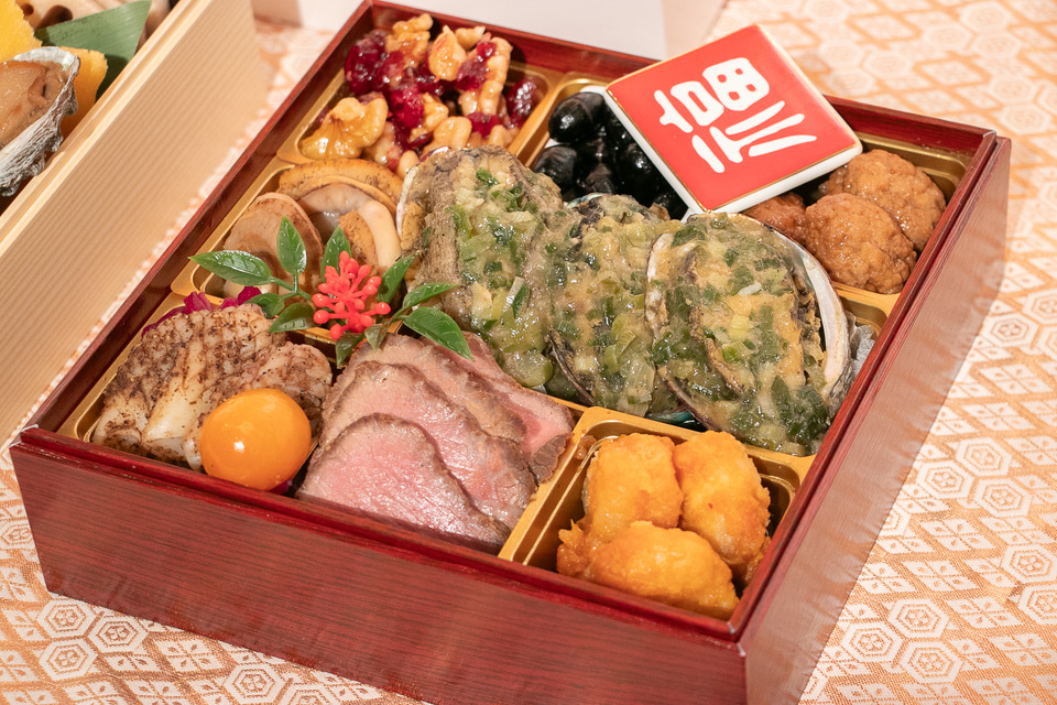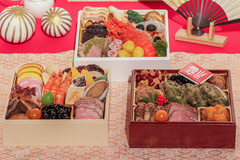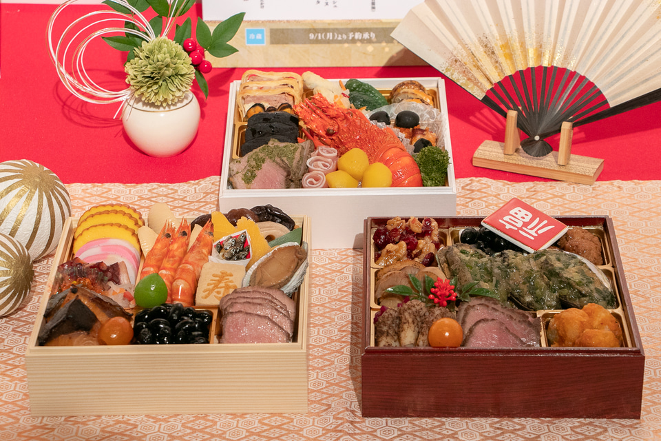 1つの大皿に伊勢エビや鯛、ローストビーフなどを豪快に盛り付けた「おせちの宴杯」(5万3784円)など“進化形”と呼ぶ新おせちなどが加わるなか、特に今シーズンの特徴の一つとなりそうなのが、同社初の3人の監修者が集結した和洋中おせち「集」(3万2184円)だ。「プロのひと品」シリーズも監修している日本料理「一凛」料理長の橋本幹造氏、リストランテ「アクアパッツア」シェフの日髙良実氏、「慈華」シェフの田村亮介氏がそれぞれの重を担当した三段重となっている。また、それぞれの重に異なる3種のローストビーフが入っており、三者三様のアプローチを味わうのも楽しみの一つ。