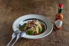 パスタにTABASCOソースをかけて食べること自体は定番的な使い方とも言えるが、冷製パスタの場合、TABASCOソースの酸味が飛ばずに残り、冷たさが辛さを感じにくくする効果もあり、温かいパスタにかけた時とはまた異なる魅力を感じさせてくれる。