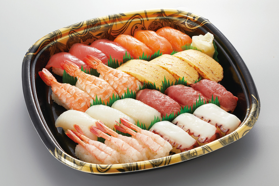 人気のまぐろやサーモンなど8種類のネタをたっぷり24貫盛り込んだお寿司セット。内容は、まぐろ、サーモン、海老、玉子、いか、ローストビーフ、甘海老、たこ。