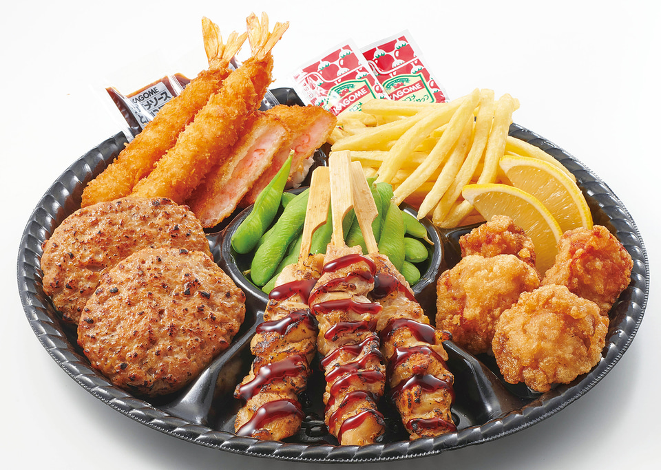 子供にも人気のメニューを盛り合わせた、洋風メニューが中心のパーティーセット。内容は、焼とり(もも)、ハンバーグ、若鶏の唐揚げ、ポテトフライ、海老フライ、海老カツ、枝豆。