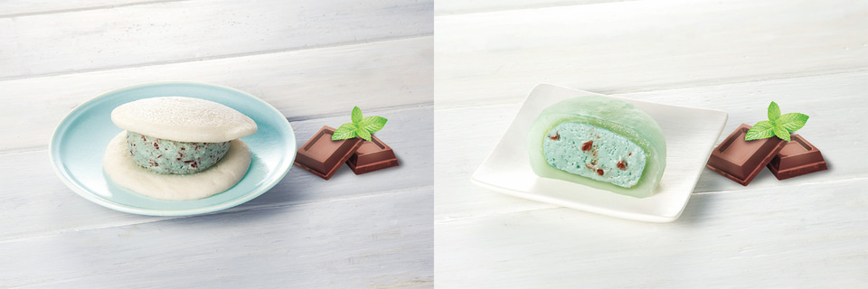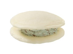 チョコミントとの相性を考えたもちもちっとした白い生地に、チョコレートフレークを混ぜ込んだミントクリームを挟んだ。清涼感のあるクリームの味わいとチョコレートフレークの食感が織りなすハーモニーが楽しめる。価格は226円。