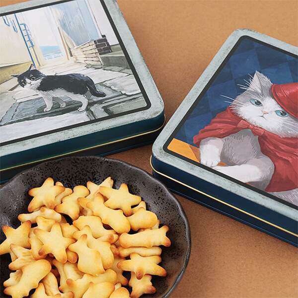 肖像画のようなネコ、路地裏で振り返るネコなど「なんだかエモい」イラストがデザインされた缶(約120×120×25mm)で、ヒトデやイカなどの形をしたビスケット(約25g)が入って価格は432円。