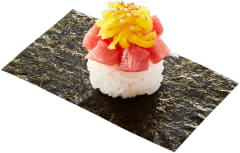 本鮪中とろにたくあんを合わせ海苔で包んだ。