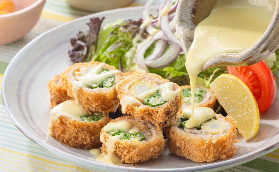 オクラとヤングコーンを豚ロースで巻きあげ、サクッと香ばしく揚げた一品。南国風の特製ソースは、マヨネーズをベースにパルメザンチーズでコクをプラスして、パイナップルの甘みと酸味に、隠し味のにんにくがアクセントを添えている。