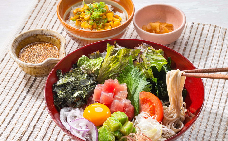 ハワイのローカルフード“アヒポキ”をサラダ仕立てにし、喉ごしのよい蕎麦と合わせた一品。ピリ辛のコチュジャンだれと、バター醤油の香ばしさ、とうもろこしのやさしい甘みが広がるごはんとの組み合わせを楽しめる。