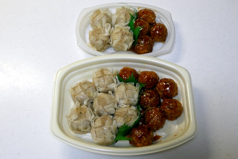 「こだわり肉シュウマイ&肉団子(黒酢入りだれ)」は、玉ねぎとタケノコが入った肉シュウマイと、黒酢入りだれを絡めた肉団子を盛り付けた商品。通常商品は各4個入りだが、今回の商品は各7個入りとなっている。本来は“ざっくり40%”増量のはずだが、実際には75%の増量と、明らかに計算を間違えた商品設計だ。