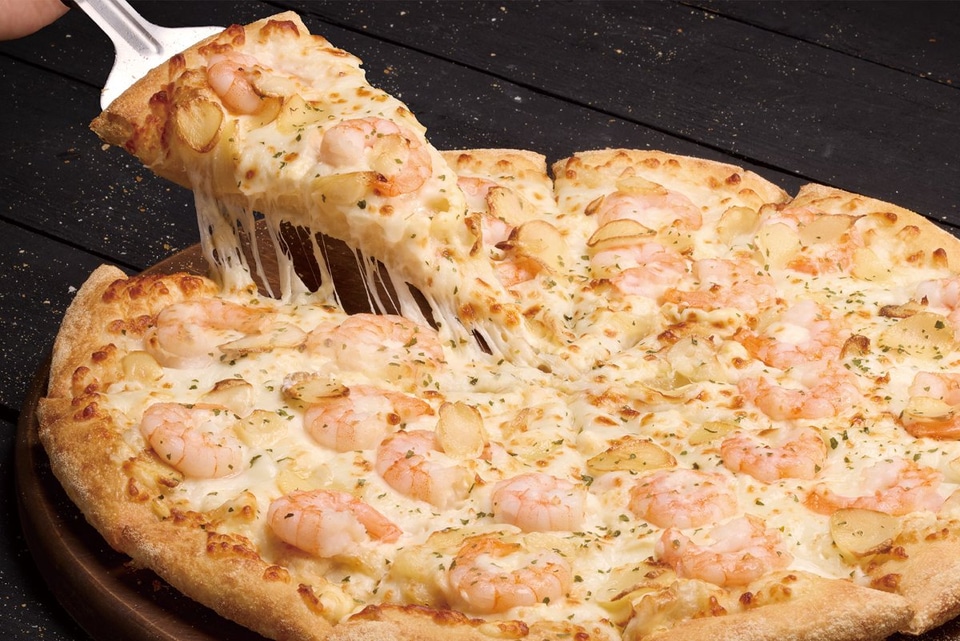 大エビが通常の2倍。ガーリックの香ばしさと特製マヨソースが、たーーっぷりチーズと合う。