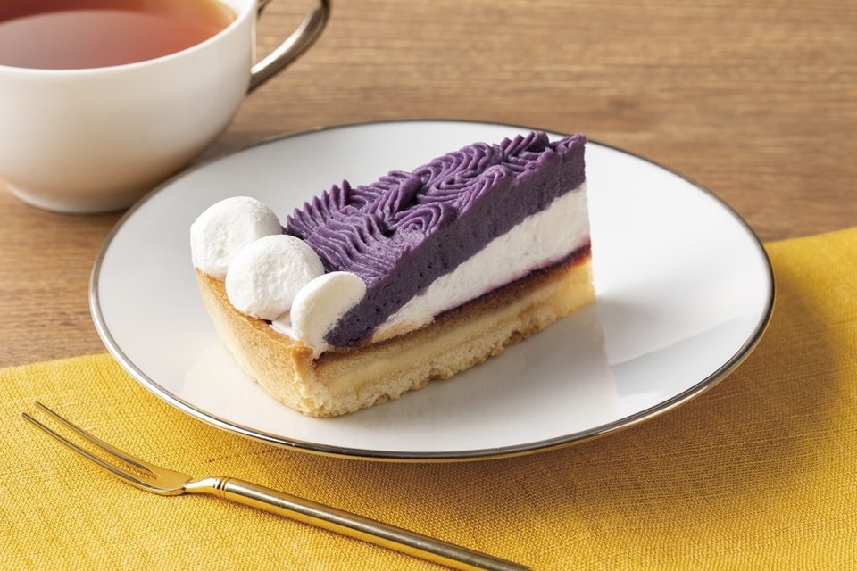 「紫芋とカシスのタルト」は、紫芋とカシスを組み合わせたタルトケーキ。紫芋クリームとホイップクリームに甘酸っぱいカシスソースを重ね、ほどよい酸味が感じられる。