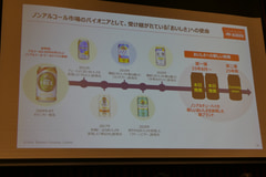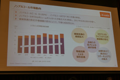 木村氏は冒頭、お酒を取り巻く社会環境や消費者の意向が変化するなかにおいて、同社として「DRINK FOR FUTURE ―未来に向けた責任―」というスローガンを掲げ、酒類メーカーとしての社会的責任を果たしていくという方針を説明。さまざまな啓発活動を行なったり、学術的な研究に取り組んだりすることとあわせ、ノンアルコールや低アルコールの構成比を増やしていくとする。