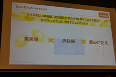 同社では、おいしさへの期待と実態にギャップを感じている人が多く、これがトライアルの障壁になっているとして、「お酒のような飲みごたえ」「果実感」「爽快感」を追求したとしている。