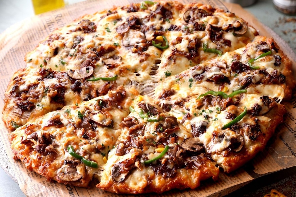 炭火で焼き、旨みを引き出したジューシーな牛肉と、チーズやブラウンマッシュルーム、コーンなどの野菜をトッピング。