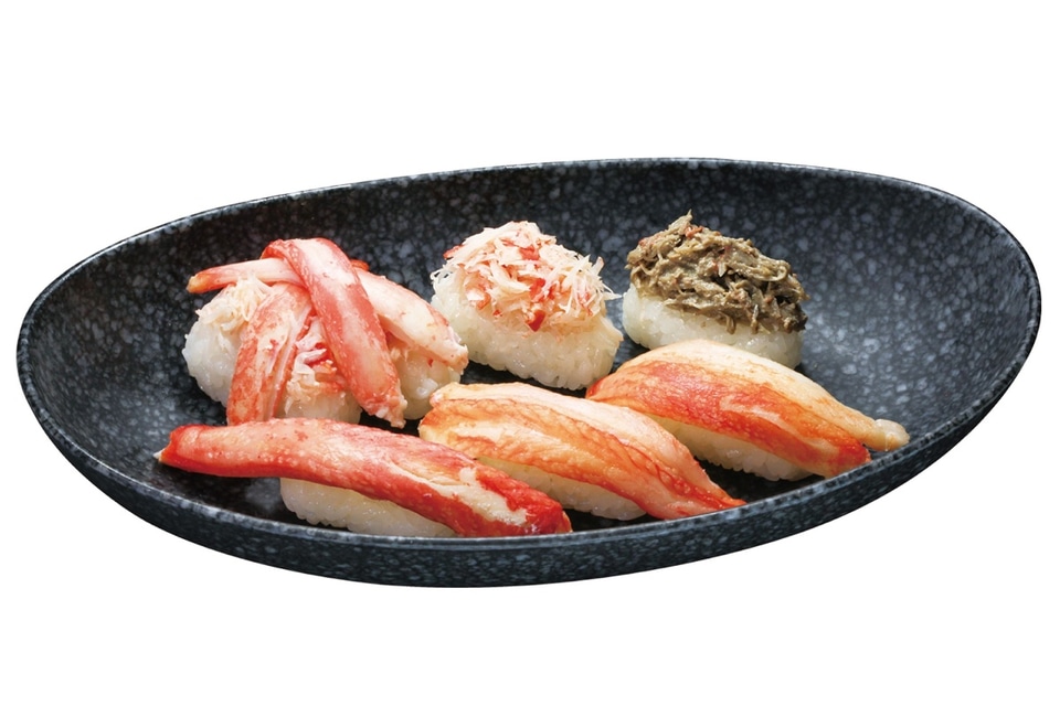 「特大本ズワイガニ(一貫)」は、“カニの王様”といわれる本ズワイガニを使用し、特大な大きさでカニの旨みと甘みが楽しめる。「本ズワイガニ二種盛り」では、本ズワイガニの濃厚な旨みが楽しめる開き身とふわふわとした食感のかに身を一皿で提供する。「本ズワイガニ軍艦(一貫)」は、手に取りやすい一皿130円とした。さらに「丸ズワイガニ大(一貫)」では、丸ズワイガニならではの詰まった旨みと甘み、豊かな香りが味わえる。