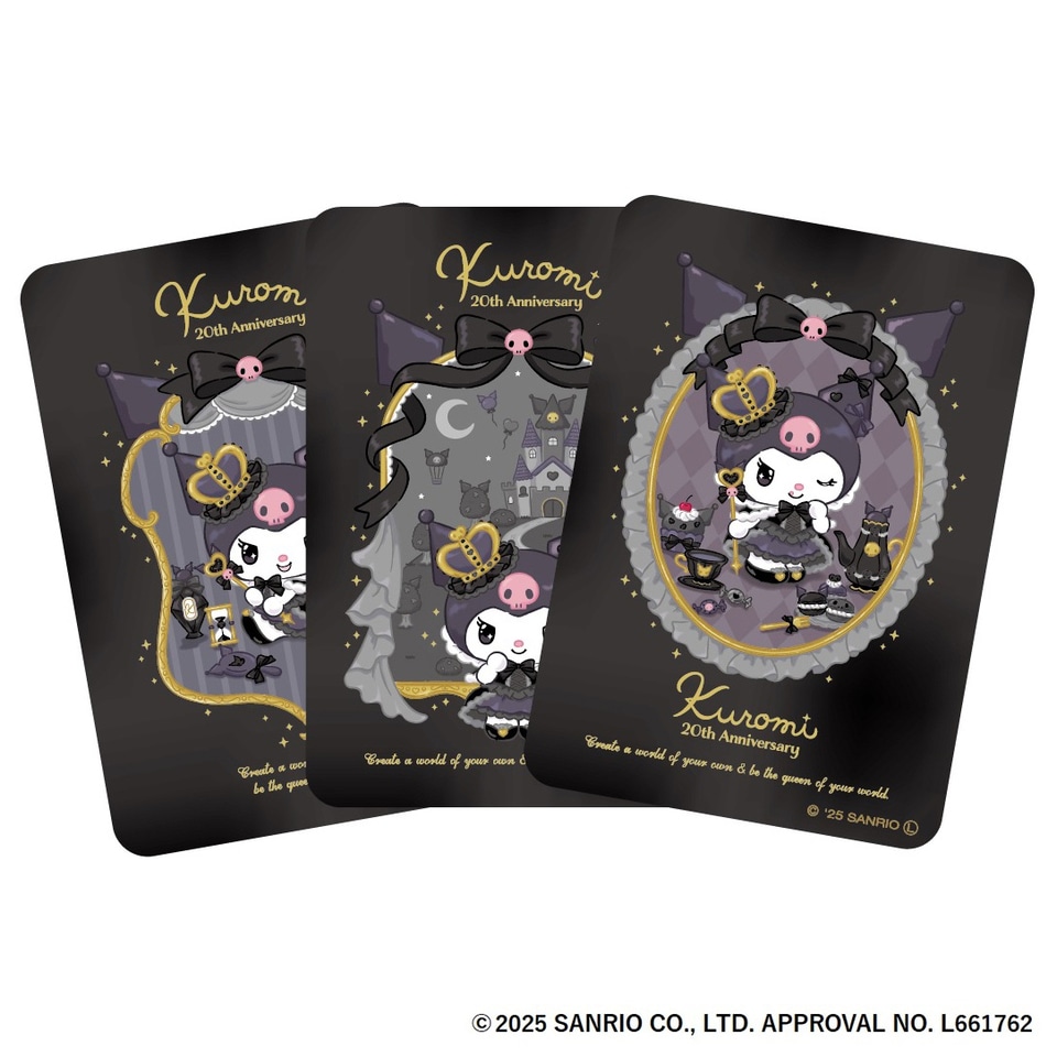 少しビターなショコラの生地にホワイトチョコレートをサンドした、スティックタイプの焼き菓子。おまけカード(全3種・ランダム封入)は、20周年限定の「クロミ王国描き起こしのクロミアート」を使用している。