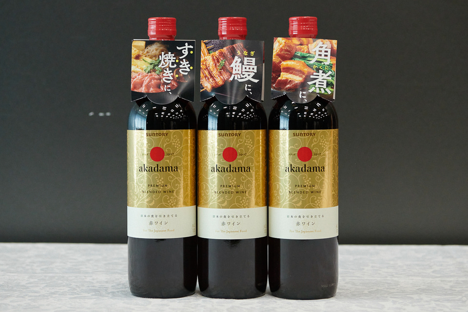 発表会では本商品と、比較用の輸入赤ワイン(フルボディ)とともに、日本の食卓に並ぶ料理の一例として「サバの味噌煮」「すき焼き」とのペアリングを体験する機会が提供された。記者も酒好きの末席の経験値から、サバの味噌煮と赤ワインの難しさは予感していたが、「赤玉プレミアムブレンデッドワイン」と組み合わせるとハーブ香のような気配が生臭さを抑えて、すんなりおいしく味わうことができた。そのあとに合わせた輸入赤ワインでは、やはり青魚独特の香りが際立ってしまう。そして甘塩っぱいすき焼きにも「赤玉プレミアムブレンデッドワイン」はすっと寄り添い、少しの果実香を残してきれいに去っていく。これも輸入赤ワインで合わせると、タンニンが目立ち(個人的には「これはこれでおいしい」とも思う)、ワインの渋みが苦手な人には気になるかもしれない。本商品の肩掛けでも「角煮に、鰻に、すき焼きに、」とうたうように、赤、白、品種、産地、料理ジャンルを気にせず、普段の食卓で気軽に楽しめるワインに仕上がっているように感じた。