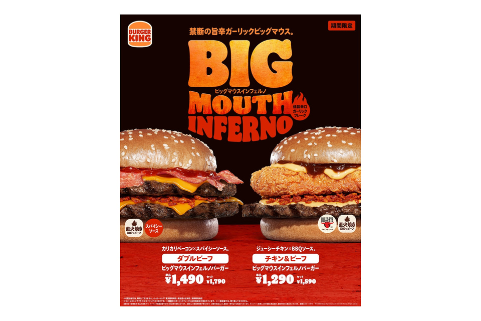 バーガーキング(ビーケージャパンホールディングス)は、直火焼きの100%ビーフパティ“ビッグマウス”シリーズから新たに「ダブルビーフ ビッグマウスインフェルノバーガー」と「チキン&ビーフ ビッグマウスインフェルノバーガー」を8月22日から期間限定で販売する。
