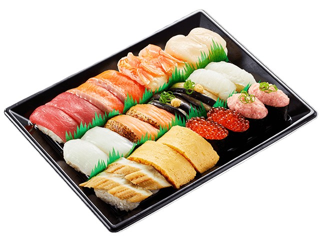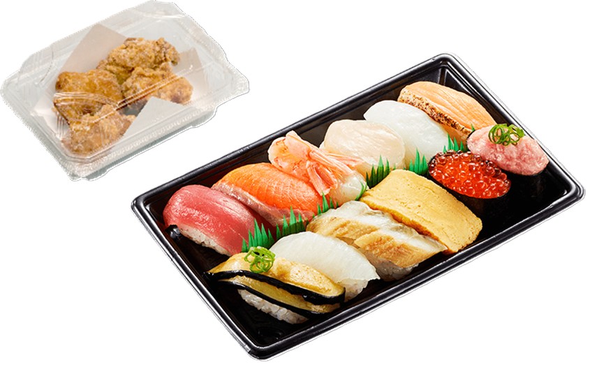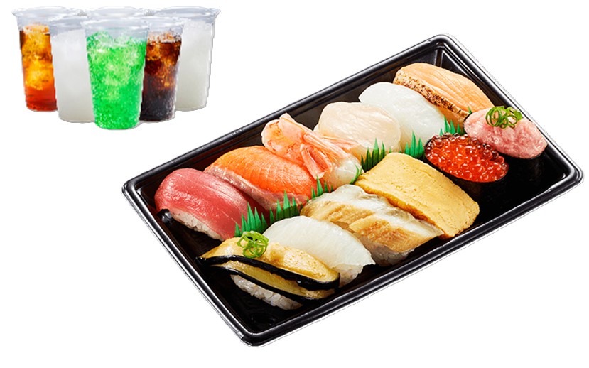 名物の「大切りまぐろ」「大切りサーモン」のほか、「ほたて」「赤えび」「特盛ねぎとろ」などが入り、から揚げやドリンクが付くセットも提供する。また、サイドメニューとおこさまメニューも充実させ、「おうちかっぱ寿司」を楽しめるようにしている。