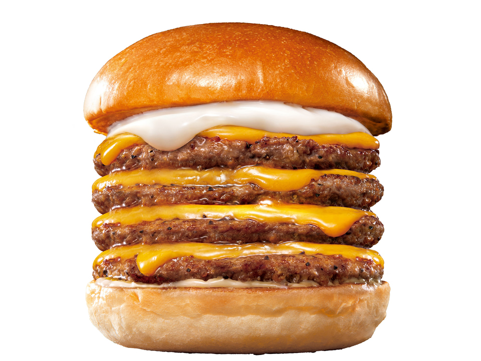 「キング 絶品チーズバーガー」は、牛肉100%パティとレッドチェダーチーズを4枚ずつ重ね、とろ~りチーズソースなどで仕上げた商品。価格は1390円。