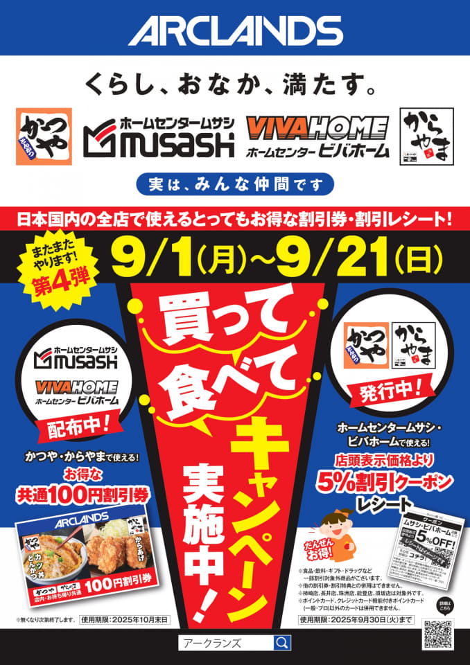 ニュースかつや/からやまとビバホーム/ホームセンタームサシ、相互で使える割引券配布 編集部:大里夏輝2025年8月25日 14:302025年9月1日~21日 実施買って 食べて キャンペーン アークランズとアークランドサービスホールディングスは「買って 食べて キャンペーン」を9月1日~21日実施する。 キャンペーン期間中、ホームセンタームサシとビバホームでは、かつやとからやまで10月末まで使える共通100円割引券を配布し、かつやとからやまでは、ホームセンタームサシとビバホームで9月30日まで使える5%割引クーポン付きレシートを発行する。本キャンペーンは第4弾となり、近年の物価高を背景に実施されている。 買って 食べて キャンペーン