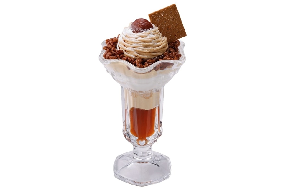 栗が香る特製モンブランケーキを添えたパフェ。北海道ソフトクリームと塩キャラメルクリームをのせ、ぷるぷるのわらび餅、コーヒービスケットをトッピングしている。