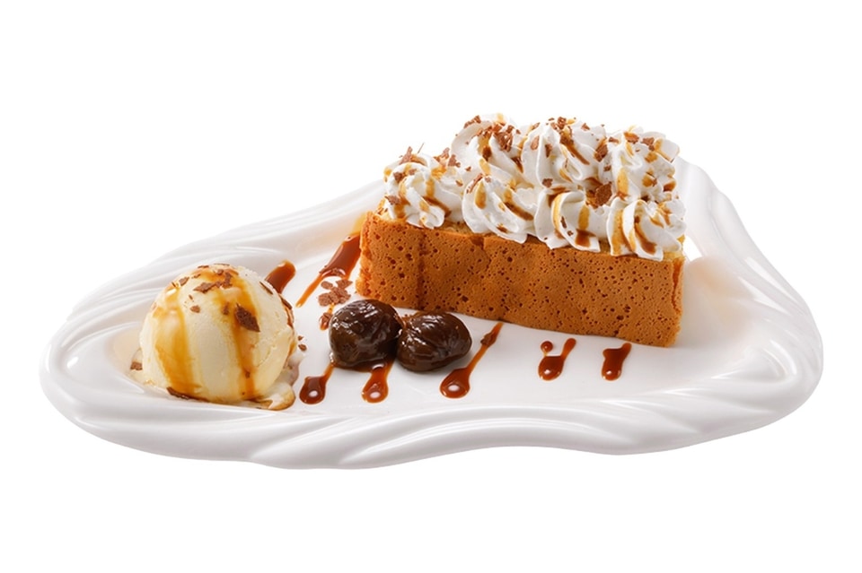 ふわふわでしっとりとしたシフォンケーキにマロンとビターキャラメルソースをあしらい、バニラアイスを添える。コーヒーと一緒に味わえるセットも提供する。