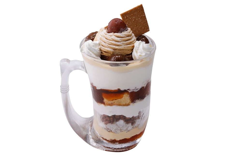 「モンブランパフェ」のトッピングに、さらにバニラアイスやシフォンケーキなどを大きなジョッキに詰め合わせた。家族や友人とシェアしながら楽しむこともできる。