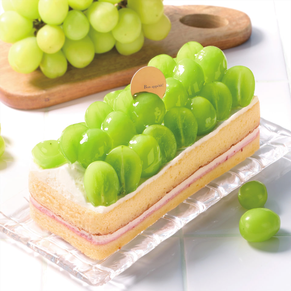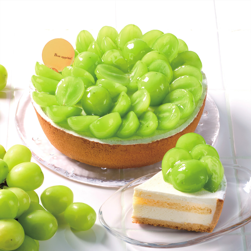 爽やかな香りのシャインマスカットムースと、濃厚な香りと甘酸っぱい味わいのぶどうムース、りんごゼリー入りりんごソースを組み合わせたケーキに、みずみずしい山梨県産シャインマスカットを飾り付けたもの。間に入れたりんごソースが食感のアクセントになった、ぶどうづくしのケーキとなっている。