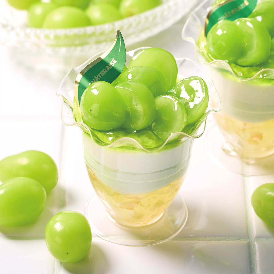 シャインマスカットとレモンで見た目も味も爽やかに仕上げたパフェ。ぷるんと爽快なレモンピール入りレモンジュレやアロエのシロップ漬けに、香り豊かなシャインマスカットクリームとホイップクリームを重ね、フレッシュなシャインマスカットをトッピングしている。