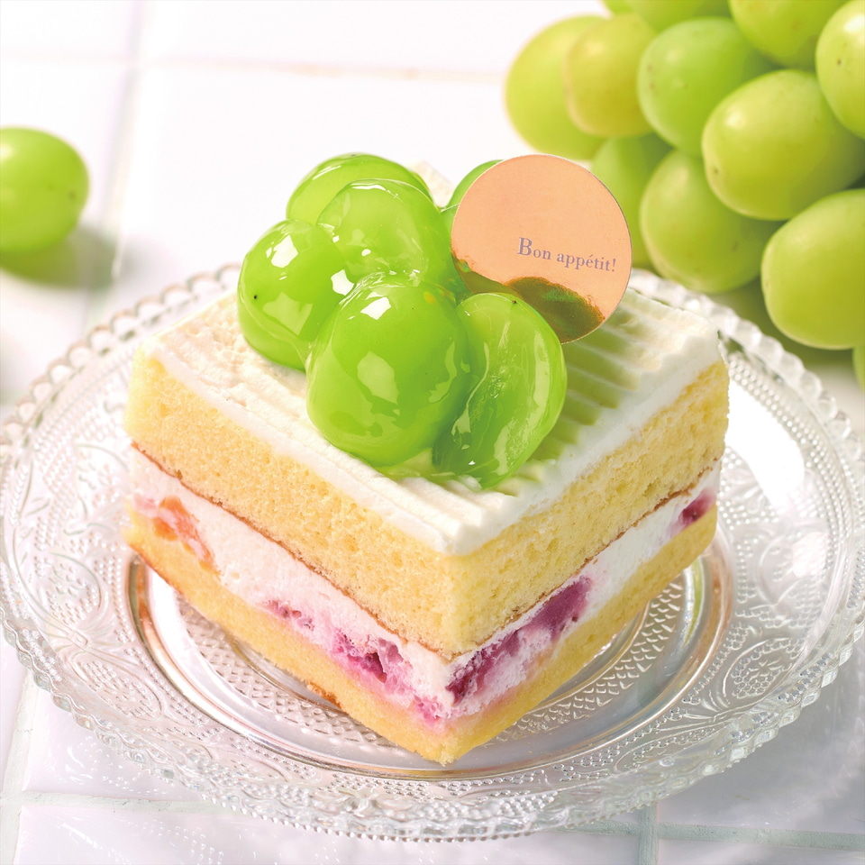 シャインマスカットとナガノパープルの2種のぶどうを贅沢に使い、ふんわりスポンジとキレのあるホイップクリームで仕立てた、今だけの特別なケーキ。間にはシャインマスカットのジュレを忍ばせ、ひと口ごとに爽やかな香りが広がる仕立てになっている。