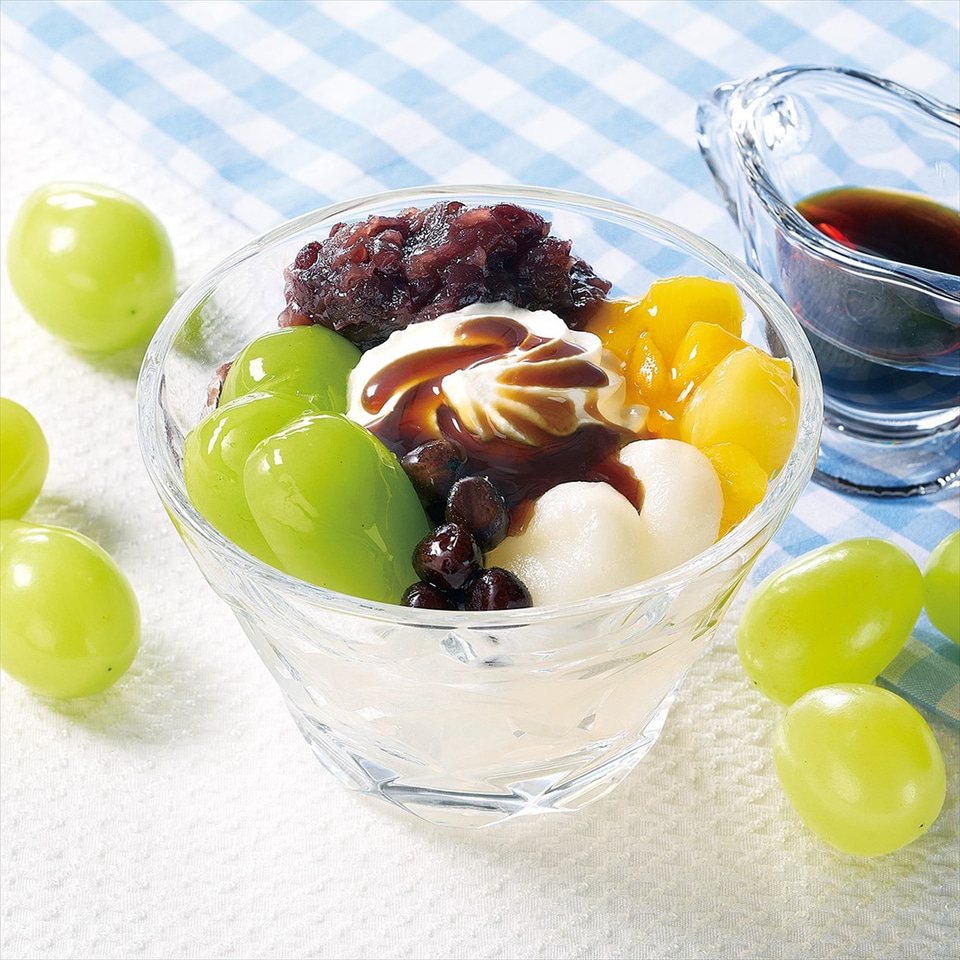 旬の山梨県産シャインマスカットを使用した季節限定のクリームあんみつ。みずみずしく芳醇なシャインマスカットと、自家炊き粒あん、マンゴーシロップ漬け、自家炊き塩豆、白玉風団子、寒天を組み合わせ、彩り豊かに仕上げられている。中央のホイップクリームや黒蜜を合わせるなど、自由に味を変えて楽しめる。