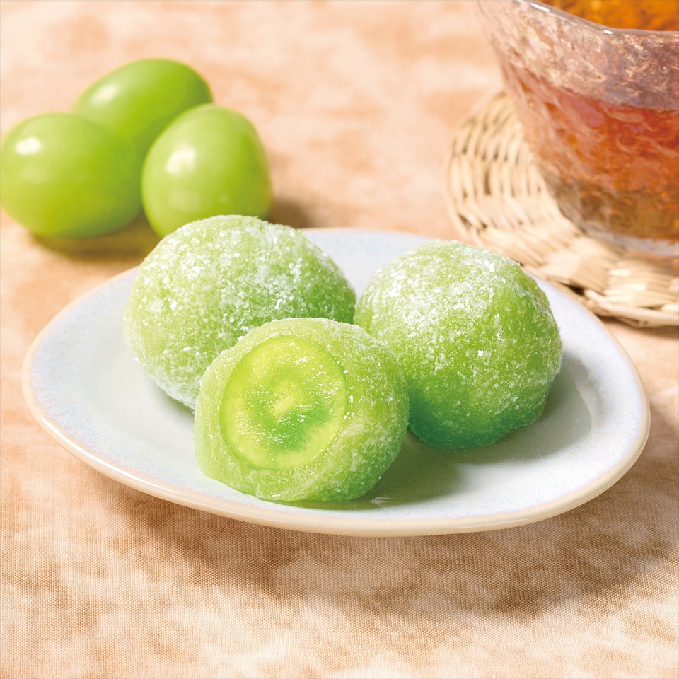 シャインマスカットを一粒使用した大福。滋賀県産羽二重もち米を使用したコシのある生地で、マスカット風味の白餡とジューシーな山梨県産シャインマスカットを丸ごと一粒包んでいる。シャインマスカットの爽やかな酸味と、白餡の優しい甘みがバランスよく調和し、贅沢な味わいに仕上がっている。