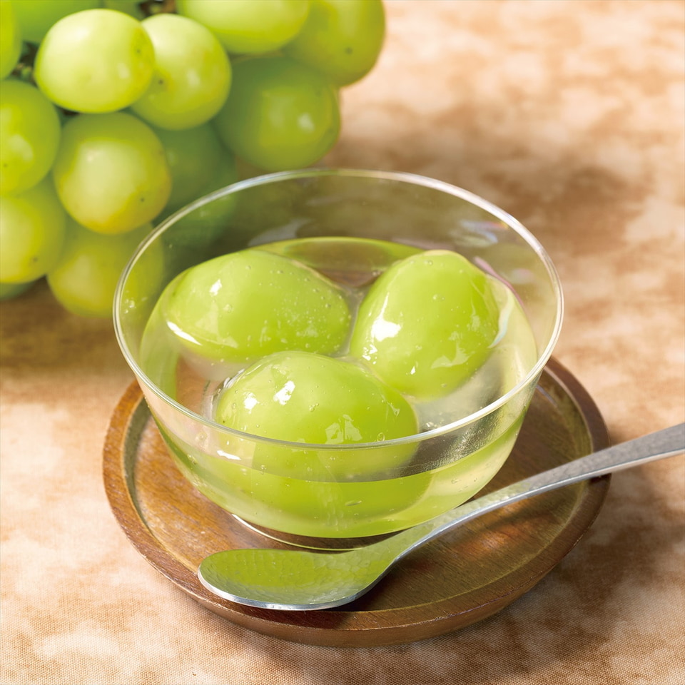 山梨県産シャインマスカットを包んだくず饅頭を、自社ワインを使用したマスカット味のクラッシュゼリーと合わせた、見た目も味も爽やかな和菓子。冷蔵庫で冷やすことで、より一層おいしく食べられる。