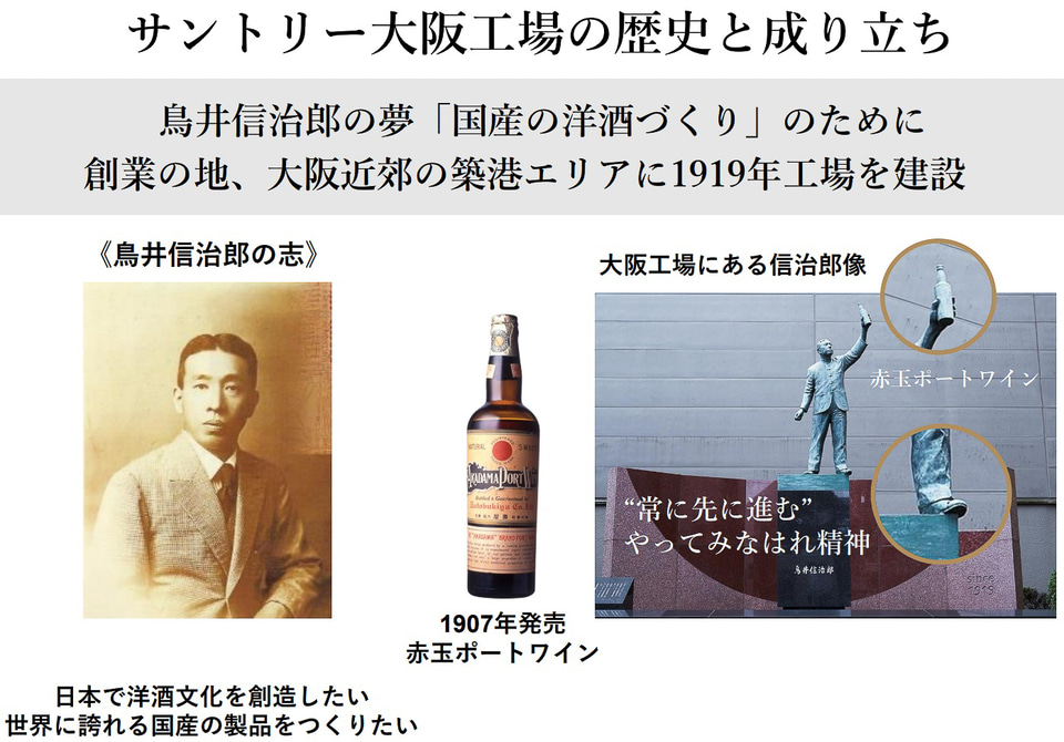 大阪工場は「赤玉ポートワイン」(1907年発売)のヒットなどを受けて1919年に建設されたサントリーで最も歴史のある工場(前身は築港工場)で、生産能力増強および美味品質向上に向けこの6月に竣工したのが「スピリッツ・リキュール工房」となっている。スピリッツ・リキュール工房ではジンや缶チューハイなどの「キー原料酒」を製造しており、本施設の完成で生産能力は2.6倍になるという。