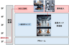 スピリッツ・リキュール工房では工程が上階から下の階へ降りていく流れになっており、5階において原料を搬入して開封するところから、計量検査、投入、容器洗浄までの工程にロボティクスを活用していく。