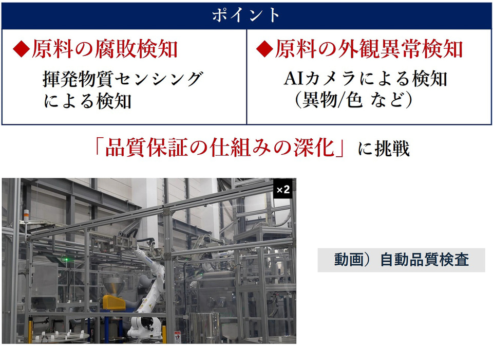 原料の投入では自動で品質検査をして揮発物質から腐敗検知を、AIカメラで外観異常検知を実施。データを蓄積・活用することで、品質保証の仕組みを深化させていくという。