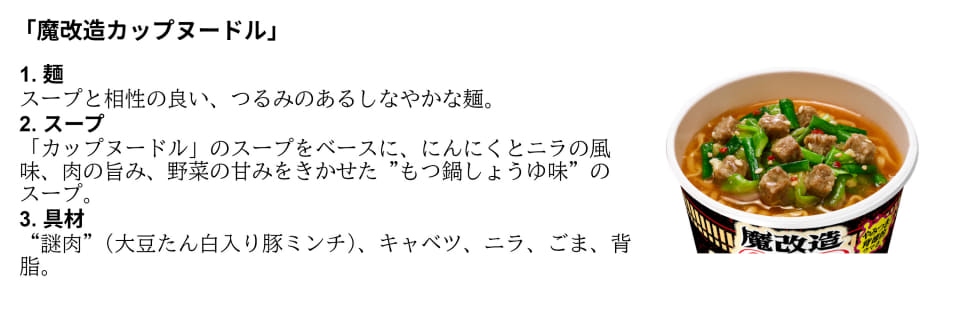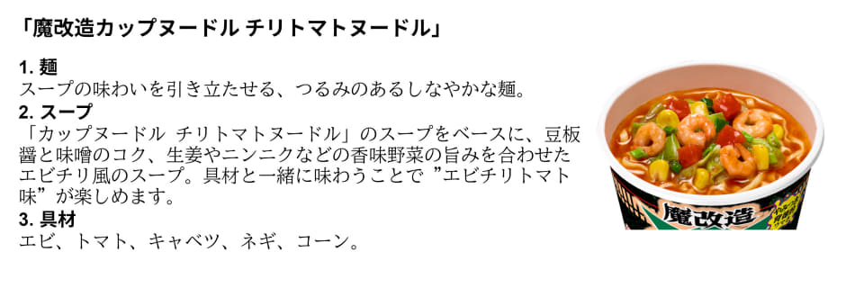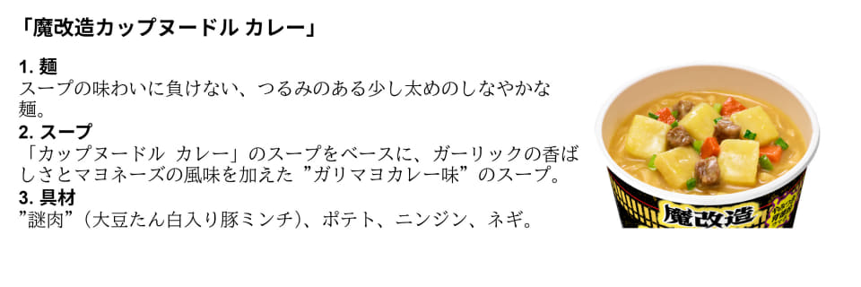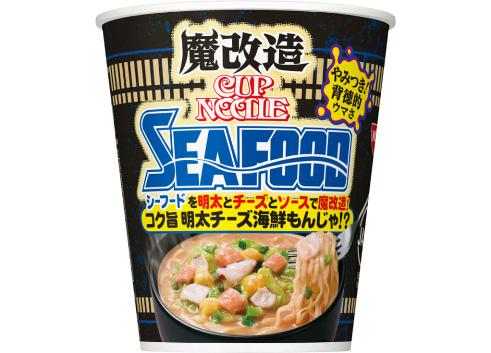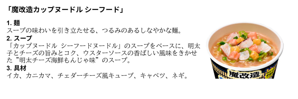 「魔改造カップヌードル」は“もつ鍋しょうゆ味"に、「魔改造カップヌードル カレー」は“ガリマヨカレー味"に、「魔改造カップヌードル シーフードヌードル」は“明太チーズ海鮮もんじゃ味"に、「魔改造カップヌードル チリトマトヌードル」は“エビチリトマト味"にそれぞれ“魔改造”されており、背徳的なウマさがあるという。