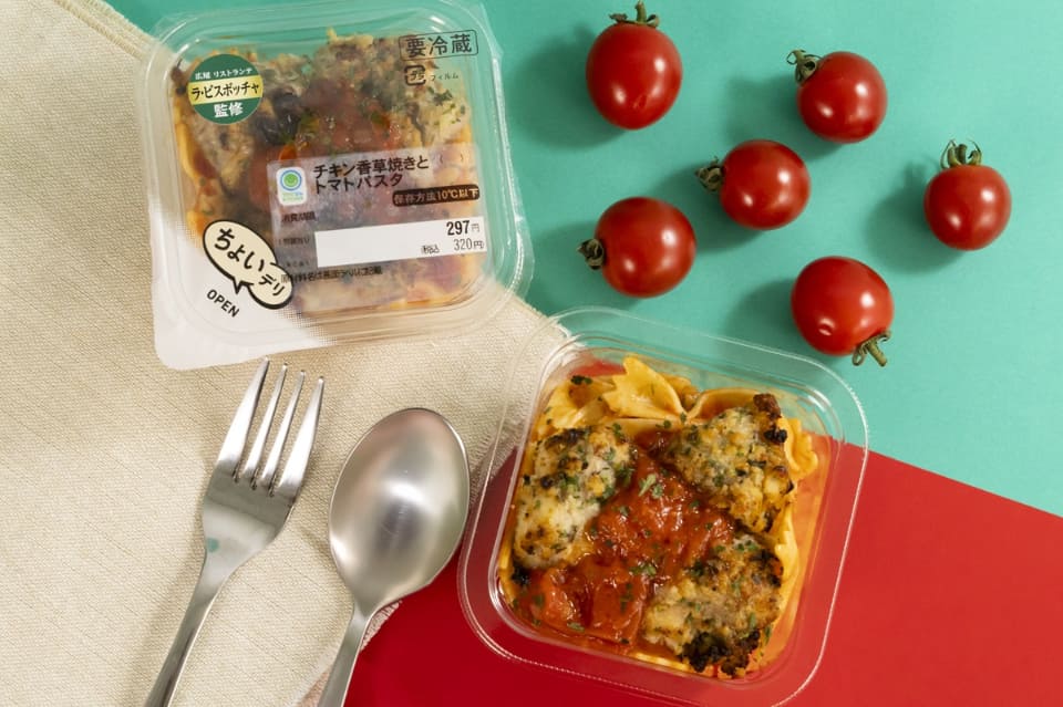 内容: 冷たいままでも食べられるちょいデリの商品。バジル・オレガノ・ローズマリーなどの香りをきかせたチキンの香草焼きに、トマトのソースとショートパスタを合わせており、おかずにもおつまみにもピッタリだという。ソースには玉ねぎやにんにく、チーズを使用し、コクのある味わいに仕上げている。