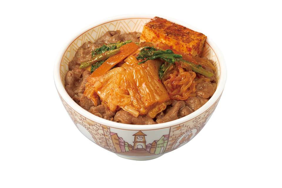 特製のすき焼きダレがしみ込んだ白菜や春菊、人参、しらたき、大ぶりの焼き豆腐、卵黄を牛丼にのせた期間限定メニュー。今年は新たに春菊を加えたほか、特製のすき焼きダレをすっきりとした甘さに調整し、牛肉や具材本来の旨みをより引き立てる味わいに仕上げた。また、唐辛子やコチュジャンがきいた“辛旨”な「月見辛旨すきやき牛丼」を今年も販売する。
