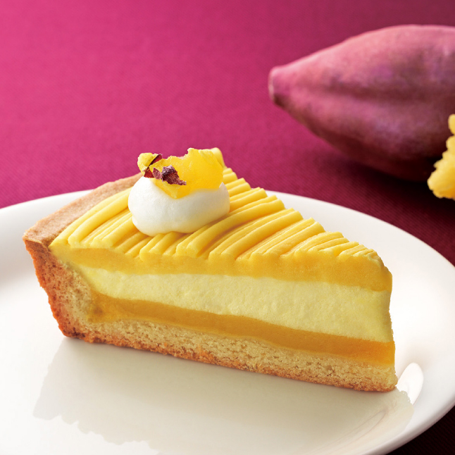 紅はるかペーストを練り込んだ生地に、紅はるかのホイップクリームとねっとりとした紅はるかクリームを重ねた、秋らしいタルト。角切りのさつま芋をトッピング。