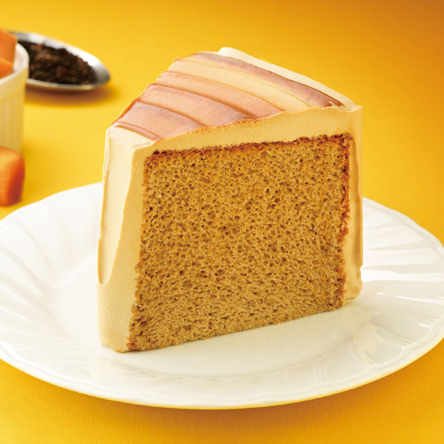 アールグレイの豊潤な香りと、ほろ苦いキャラメルの風味がふんわり広がるシフォンケーキ。天面にはマーブル模様のソースをあしらい、秋らしい彩りに仕上げた。