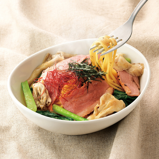 トリュフの上品な香り、脂身がとろける合鴨、しゃきしゃき食感の小松菜、香り高い舞茸が織りなす、贅沢な味わいのオイルパスタ。秋冬の味覚代表格の「きのこ」、しっとりとして鶏肉に比べ旨味が強い「合鴨」、そして冬が旬の「小松菜」を合わせた。ソースは、甘口醤油ときのこの旨味を凝縮しただしつゆに、芳醇な香りのトリュフオイルを加えた和風仕立て。