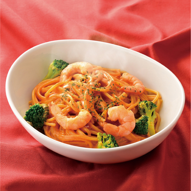 濃厚でクリーミーな海老の旨味たっぷりのビスク風ソースに、ブロッコリー、ぷりぷりの海老、もちもち食感のフェットチーネを合わせた。プラス100円で糖質50%オフ、約120キロカロリー減、食物繊維10倍の低糖質麺