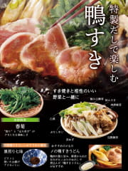 特製だしで楽しむ「鴨すき」は、黒糖とたまり醤油を使った「すき焼きだし」に、旨みと甘味を出す焦がし玉ねぎを加え、鴨脂でコク深く仕上げた。“香り”と“ほろ苦さ”がクセになる「春菊」をはじめとして、「肉厚椎茸」「味えのき」「完熟舞茸」など、すき焼きと相性のよい国産野菜を豊富に取り揃える。さらに、溶き卵に「黒煎り七味」を加え、山椒がピリッときいた大人な味変を楽しめる。〆には、鴨肉の脂と旨み、野菜から出た甘みが特徴のだしで煮込んだ「うどん」がおすすめだという。