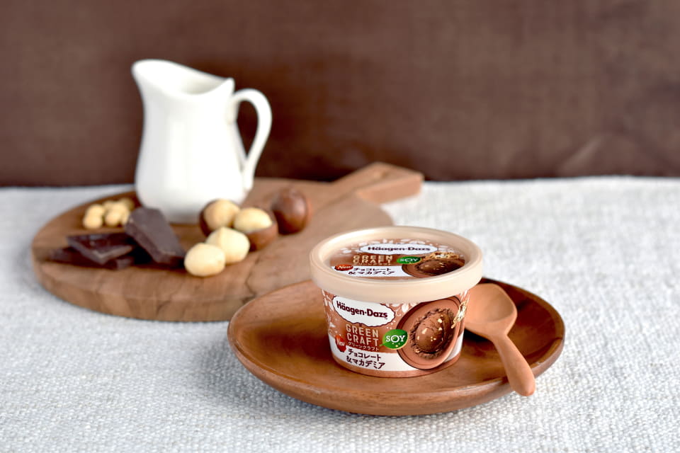 エクアドル産カカオマスの使用で豆乳の風味を抑えつつ、チョコレートの華やかな風味や深みを引き出した。チョコレート好きも満足できるよう、チョコレート原料を増量し、約80%の人が豆乳で作られたアイスと気づかないほど濃厚な味わいに仕上げた。ベースの豆乳の風味を抑えた食べやすさは保ちながら、ハーゲンダッツらしいコクとクリーミーさを一層感じられるよう、豆乳原料の配合を調整。後味はすっきりと心地よく、香ばしくカリッとしたマカデミアナッツが濃厚なチョコレートアイスにアクセントを添える。
