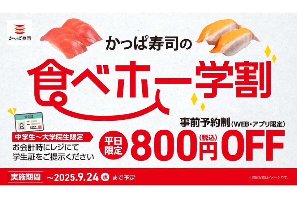 「かっぱ寿司の食べホー」を9月24日まで延長! 平日学割800円引きも継続