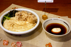 昨年は月見にちなんで“お月味”と称して「焼きたて牛すき釜玉うどん」「粗挽き肉チーズ釜玉うどん」を販売していた同社だが、消費者の意向を改めて調査したところ、9月も夏の季節同様に「冷たい食べもの」や「さっぱりしたもの」が求められているとして、あえて冷たいうどんで勝負することにしたという。