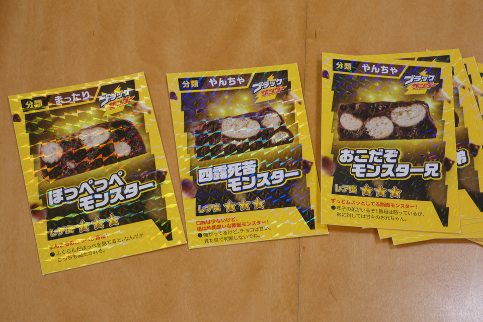 断面モンスターは“ブラックサンダーの中に潜む個性豊かなモンスターたち”という設定の下、同社では「にっこりモンスター」や「ういっすモンスター」など、全40種類の断面モンスターをキャラクター化。ブラックサンダー断面モンスター図鑑としてWebサイト上で公開している。