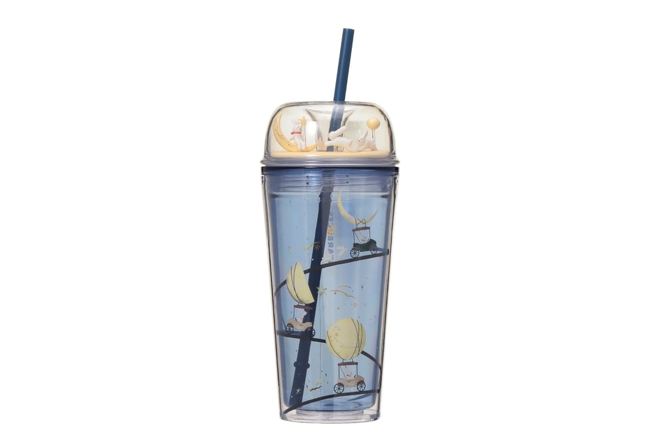 三日月を運ぶウサギたちをかわいらしく描いたコールドカップタンブラー。リッド部分には立体的なフィギュアを配し、夜空をイメージしたネイビーを使用している。