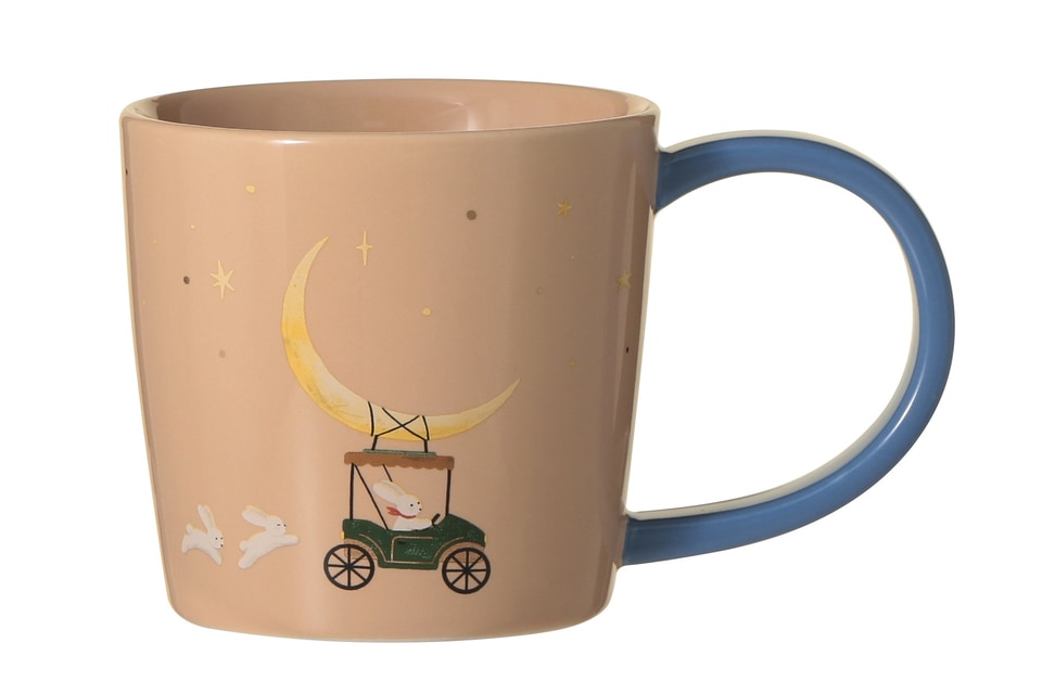 三日月を運ぶウサギたちをかわいらしく描いたマグ。月明りをイメージした柔らかなムーンベージュを採用している。