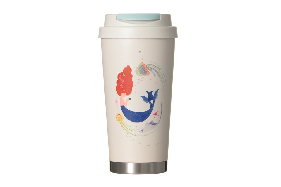 かわいらしいタッチで描かれたサイレンと海の生き物たちが海の中を舞っているようなステンレスタンブラー。真空二重構造ステンレスで、保冷性に優れている。