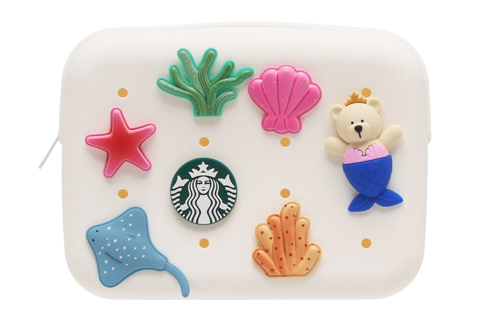 ベアリスタと海の仲間たちが彩るシリコンポーチ。表面に小さな穴が開いており、専用チャームを自由に付け替えて楽しめる。
